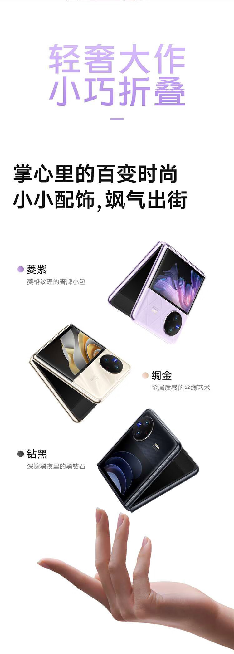 商品名稱(chēng):vivo X Flip 12GB+256GB 菱紫 輕巧優(yōu)雅設計 魔鏡大外屏 懸停蔡司影像 驍龍8+ 芯片 5G 折疊屏手機 xflip